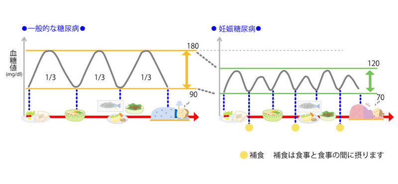 通常の糖尿病の食事療法と妊娠糖尿病の食事療法の違いは、目標とする血糖値の範囲です。