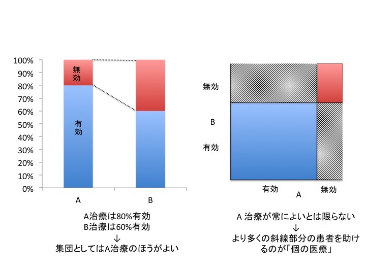 それが臨床試験の結果の「個の医療」への応用の限界です。つまり、個々の患者さんに対する医療と集団に対する臨床試験の結果は必ずしも一致しないということが、もっとも重要なメッセージなのです。