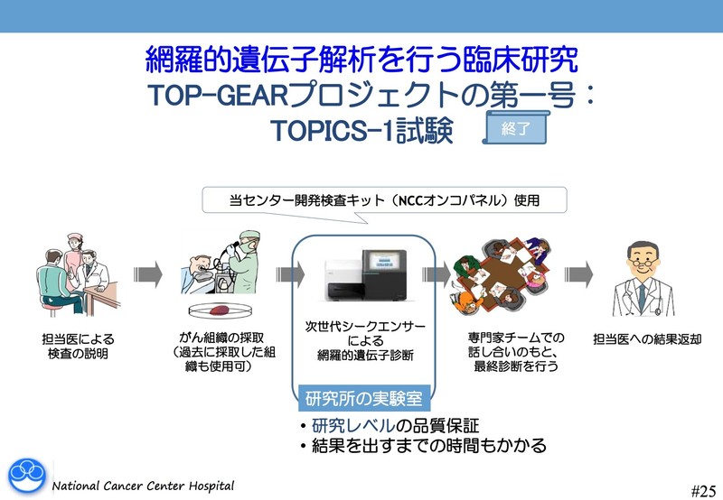 先端医療科などにおいて、生検や手術で採取されたがん組織のゲノムを調べて専門家チームがその解釈をする。そして医師が患者さんに説明をして、場合によっては臨床試験などに入っていきます。これがTOP-GEARの大きな流れです。