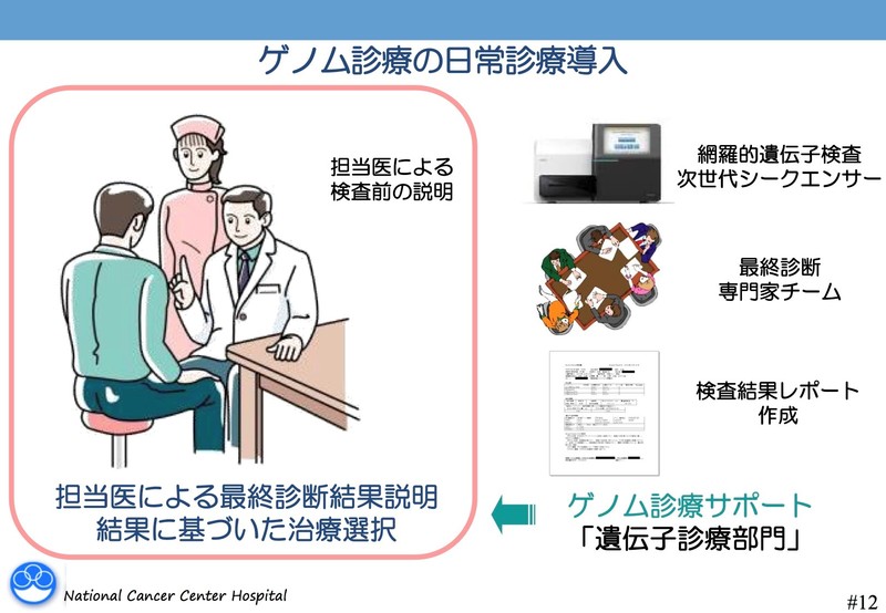 我々のところで検査だけを請け負って結果をお知らせし、その後は他の施設で治療を受けるということは基本的にありません。事情により転院は必ずしも不可ではありませんが、国立がん研究センターで治療を受けることを前提に研究に参加していただき、遺伝子変異が陽性であれば薬の臨床試験に入るというのが主な流れになっています。