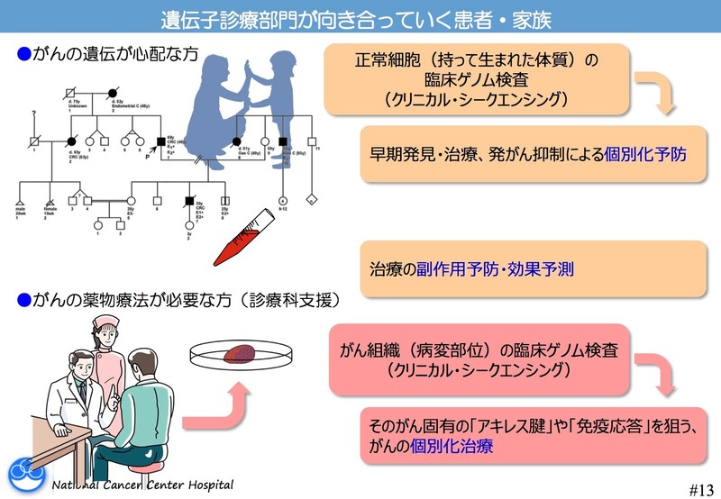 患者さんにとっての遺伝子診療部門の役割は、大きく分けて2つあります。がんの遺伝が心配な方については、血液(末梢血)を採取して遺伝性腫瘍のリスクについて調べます。もうひとつは、抗がん剤の治療が必要な方で、今までの標準治療では効かなくなって再発をしている、あるいは副作用が強いという方の場合です。これについては採取されたがん細胞の遺伝子の変異を調べ、それに応じた治療法の選択をします。
