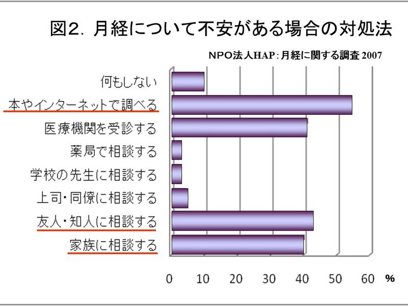 月経について不安を持っている女性が、どのような対処法をとっているかについてインターネットを用いて調査してみると、友人・知人・家族に相談する女性が大半で、医療機関を受診する女性の割合は限られていました。