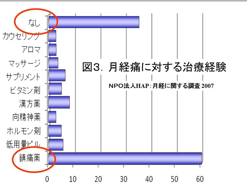 月経に関連する問題はひとり一人で大きく異なりますので、この結果は多くの女性が正しい対処法に結び付く情報を十分に得ていないことを示唆しています。また月経痛に対する治療経験では、多くの女性が鎮痛薬を使用する対症療法の一時的な効果に頼っています。