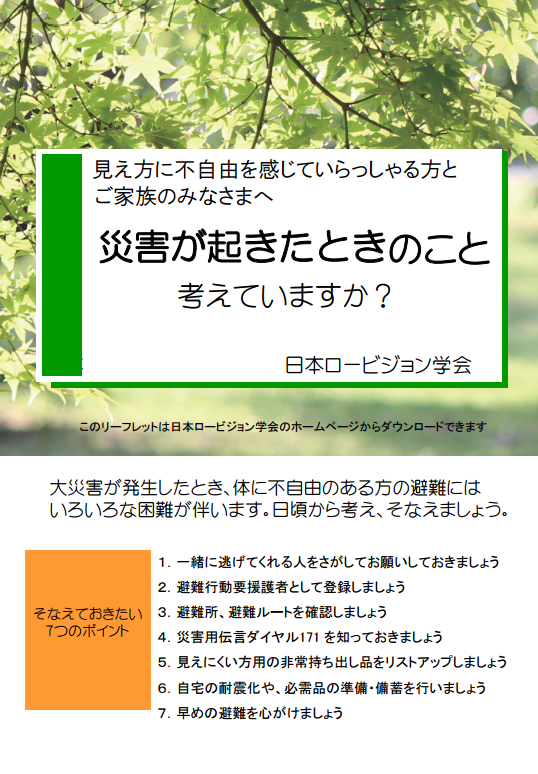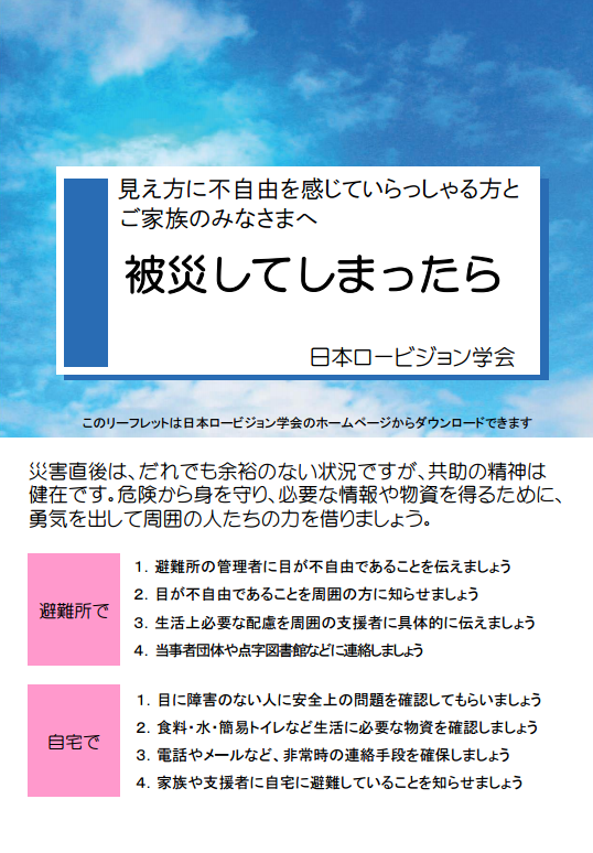 日本ロービジョン学会が直接被災地に行って、ロービジョンの方に支援をすることは難しいのが現状です。そこで今回、ロービジョン学会では「震災に会う前にどういう準備をしておけばよいのか」「もし震災に遭った場合、避難先でどうすればよいのか」をポイントで記した災害対策のリーフレットを作成しました。