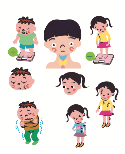 甲状腺機能低下症は、甲状腺ホルモン不足によって成長障害、むくみなどが起きます。甲状腺機能亢進症は、甲状腺ホルモン過剰によって動悸、手のふるえ、体重減少などが起きます。