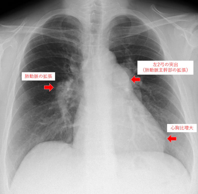 こちらは肺高血圧症患者さんの胸部レントゲン画像です。肺高血圧症による肺動脈および右心室・右心房の拡張による変化がみられます(矢印部分)。