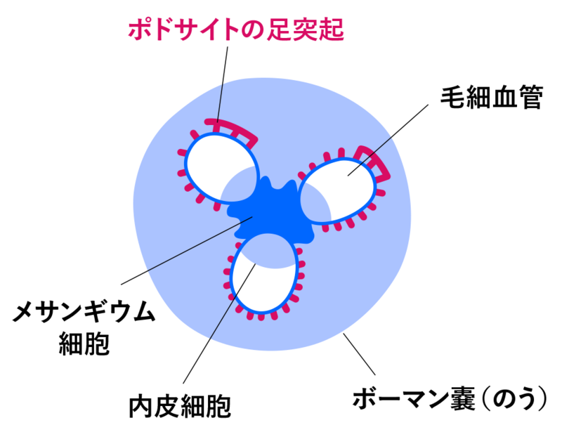 腎機能障害の詳しいメカニズムは解明されていませんが、エプスタイン症候群でもっとも問題となる症状が腎機能障害です。腎臓の尿生成機能をつかさどる糸球体には、ポドサイト(別名:足細胞、タコ足細胞)という細胞があり、MYH9遺伝子R702変異によってポドサイトの骨格に異常が出ることで、血液のろ過機能に異常をきたし、タンパク尿が出るといわれています。タンパク尿は糸球体や尿細管(尿の通り道)にダメージを及ぼし、この結果として、腎機能障害が引き起こされます。