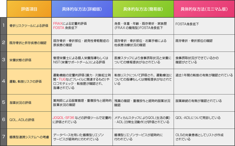 骨粗鬆症マネージャーはOLS-7の評価項目を網羅し、継続的に管理していく必要があります。7つの評価項目に対して、それぞれ詳細版、簡易版、ミニマム版の具体的な方法があります。