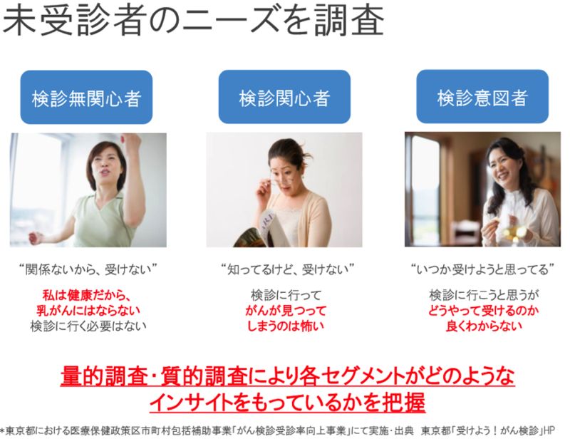 まずは検診未受診者のニーズを調査しました。すると未受診者の方々のニーズは上図のように検診無関心者、検診関心者、検診意図者の3つのセグメントがあることが把握できました。