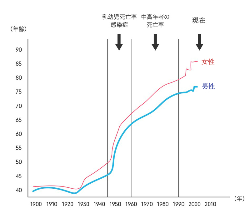 そして現在では平均寿命が80歳を超えました。バブル崩壊といった経済ショックやストレス社会、国民の運動不足、睡眠不足といった問題を抱えながらも日本の平均寿命はさらに延び続けています。この背景には医療の進歩や生活水準の向上などが挙げられていますが、どのような因子が寿命延長の大きな要因となっているかについては今も検討が続けられています。