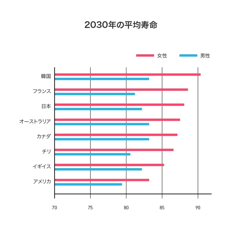 そしてもう一つ驚くべきことは、世界1位と予想された韓国の女性平均寿命が90歳を超えていることです。これまで人間の平均寿命が90歳を超えることは不可能だろうと考えられていました。そのため2030年にはその壁を越えていくというデータが示されたことは世界に非常に大きなインパクトを与えました。