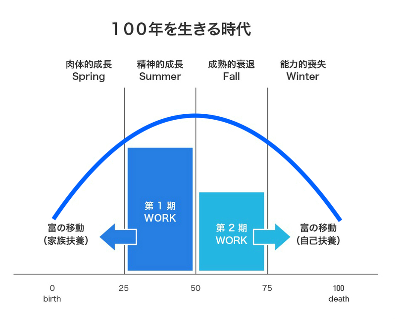 その答えの1つとして、人生100年時代では、いわゆる元気に働いてぱったりなくなってしまう「ピンピンコロリ」ではなく、100年を25年ずつ、4つのフェーズに分けて捉え、放物線を描くように成長と衰退を考えていくのがよいのではないか、という考え方ができると私は考えています。これまでは1つの企業に属して60代で定年退職というのが常識であったかもしれませんが、人生100年時代では人生をまるで春・夏・秋・冬の四季のように捉え、ちょうど中央に位置する50歳では第2の仕事を始める、という構図が組み立てられ、これからはそうした人生設計が常識となる時代が来るかもしれません。もしこうした人生設計が実現するとしたら、人々の働き方は非常に大きな変容を遂げることになるでしょう。