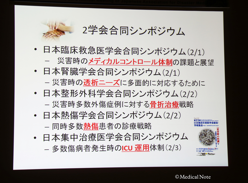 また、災害時の医療を担うのは医療従事者と関連機関のすべてです。つまり、災害医療を専門とする者だけではなく、すべての医療従事者が災害時の医療について考える必要があります。そこで、本学会では一般的な診療を行う他学会と合同シンポジウムを予定しており、さまざまな観点から災害時の医療について考察する機会を設けています。