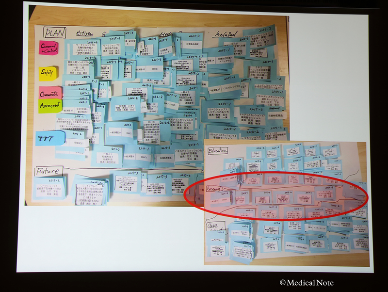 また、災害時の医療を客観視するためには、リスク知ることが非常に重要です。これは2011年以降の本学会のセッションを付箋で分類したもので、赤く囲っている「リサーチ」のセッションが少ないことがわかります。そこで今回の学会では、災害時のリスクを知り、評価するためのセッションを設けています。