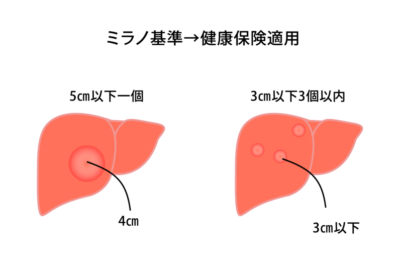 肺がんを発症としている患者さんの場合、肝移植は「ミラノ基準」という基準のなかにおさまる場合であることが必要と考えられます。ミラノ基準とは、生体肝移植の適応としてイタリアのミラノ大学の研究者が発表した基準で、世界的に用いられているものです。この基準では、がん腫瘍の直径が5cm以下1個、もしくは3cm以下3個以内であることが定められています。日本で生体肝移植を行うときには、この基準内であることが健康保険適応の基準となっています。