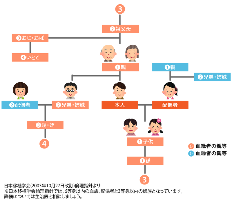 日本移植学会では、「親族」の範囲*2(6親等以内の血族、3親等以内の姻族[配偶者・配偶者の3親等以内])の方がドナーになることを倫理指針の原則としています。この原則を基本として、実際にはそれぞれの病院によってドナーについての方針が変わってきます。たとえば、神戸大学では原則として「4等身以内の親族」とした上で、患者さんごとのケースでイスタンブール宣言に反するような倫理的な問題がないか院内の適応評価委員会および倫理委員会で慎重に検討していくこととなっています。