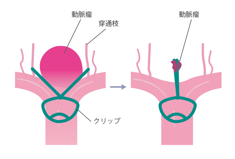 開頭クリッピング術とは、頭蓋骨を開き、動脈瘤のネック(根元)をチタン性のクリップで挟みこむ治療法です。動脈瘤への血流を止めることで、破裂を防ぎます。