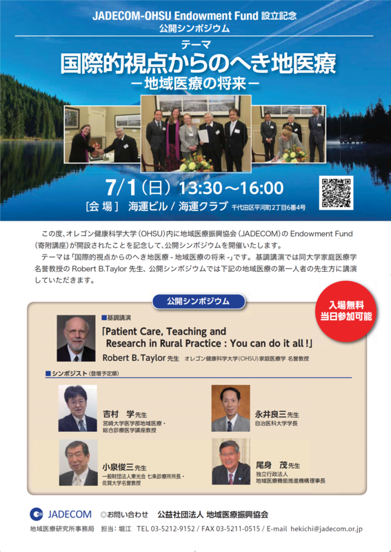 いよいよ本年秋にアメリカ、ポートランドにあるOHSU(オレゴン健康科学大学)にJADECOM地域医療学寄付講座が開設されます。これはこれまでの十数年にわたる相互交流(交換研修プログラム)が認められOHSU側からの提案によって始まるものです。この礎を築いたのが元OHSU家庭医療主任教授Robert Taylor先生ですが、そのもとで研修医時代から活躍されてきた山下大輔先生が、この度担当准教授に就任されることが決まりました。