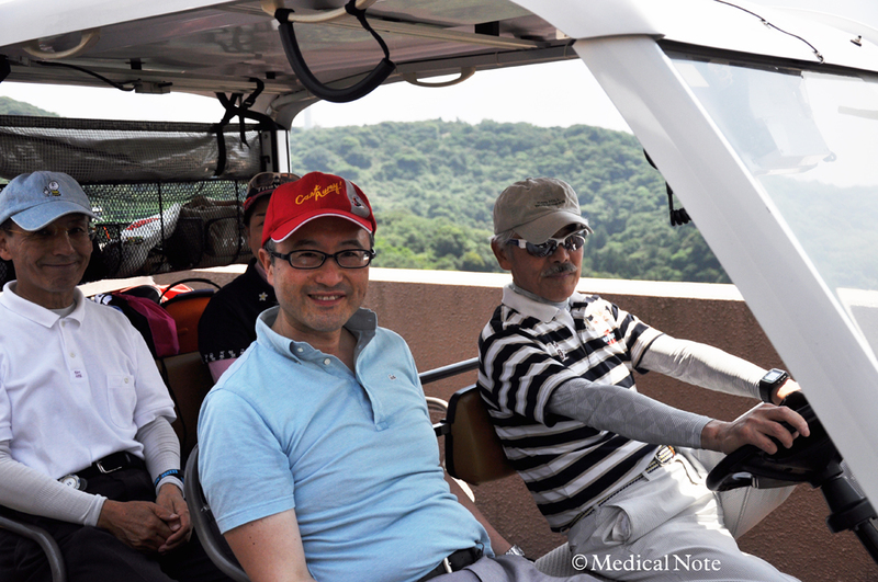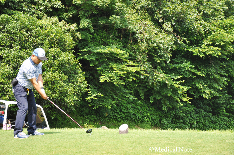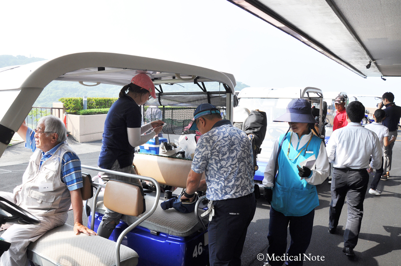 いよいよプレー開始です。それぞれの組には、医師会から参加した医師、横須賀市立うわまち病院の医師や看護師が同行し、心臓リハビリテーションの啓発と普及について指導するとともに、緊急時には迅速に対応できるように備えます。カートには薬やAEDも完備され、心臓病の経験者でも安心してプレーできる環境が整っています。