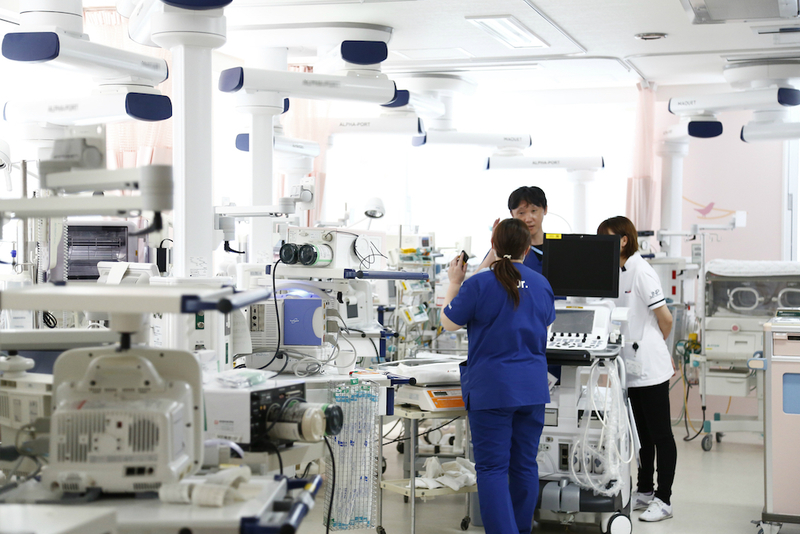 当院は、2003年12月に香川県総合周産期母子医療センターとして認定されました。2016年4月から2017年3月までの分娩数は856件であり、そのうちハイリスク妊娠が約7割を占めています。当センターのMFICU(母体胎児集中治療室)では、切迫早産や前期破水、妊娠高血圧症候群、常位胎盤、早期剥離などによる緊急母体搬送を24時間体制で受け入れています。NICU(新生児集中治療室)では、四国全域から新生児搬送を受け入れ、出生時体重1,000グラム未満の超低出生体重児等に対する周産期医療に取り組んでいます。また、小児心臓血管外科、小児外科、小児脳外科などの外科治療にも対応しています。