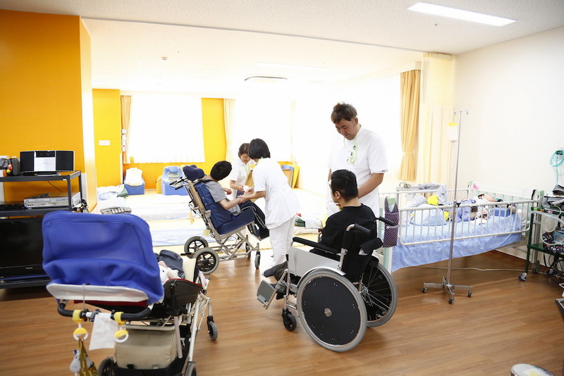 当院には、重症心身障害児(者)病棟が215床あります(2017年11月時点)。医療的ケアを必要とし長期的な入院治療が必要な患者さんが多く、病棟は患者さんにとって治療と生活の場を兼ねた場所です。季節に応じたお楽しみ会やお誕生日会、車椅子での散歩や外出、バスを利用しての遠足などを実施しています。