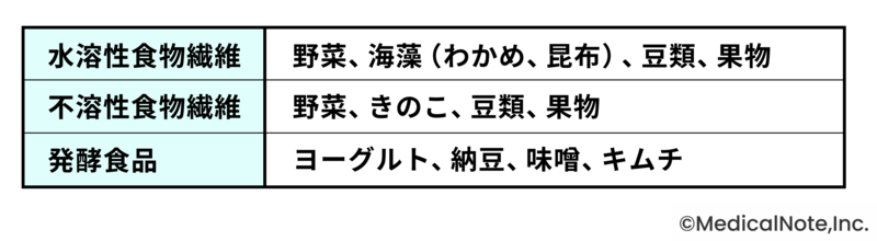 日々の食事で積極的に取りたいのが、食物繊維と発酵食品です。食物繊維は善玉菌の活動を活発にします。また、スムーズな排便を促します。発酵食品には善玉菌そのものが含まれているものが多く、食べることで善玉菌を取ることができます。
