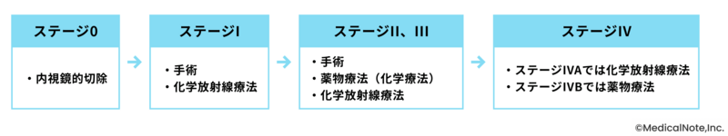 がんが粘膜下層にとどまっているステージIでは、まず手術ができる体の状態であるかどうかが評価されます。基本的に手術が可能な場合は手術が行われ、難しい場合は化学放射線療法が行われます。