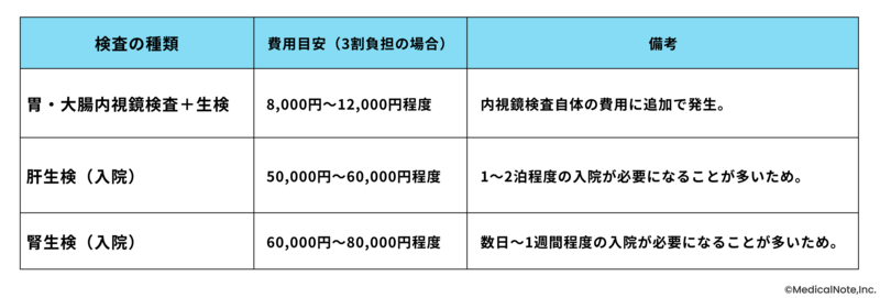日本において生検は公的医療保険の適用対象であり、自己負担額はかかった医療費の一部(通常1~3割)となります。費用は、検査の種類、採取する組織の数、入院の有無などによって変動します。一般的な目安を以下に示します。正確な費用については、医療機関や検査内容によって異なるため、検査を受ける医療機関に確認しましょう。