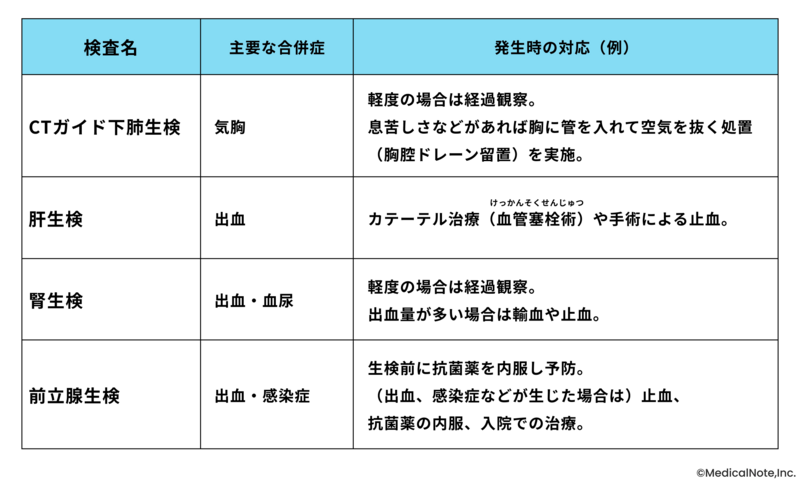 生検によって、まれに合併症が生じる場合があります。以下に主要な生検における合併症とその対応を示します。