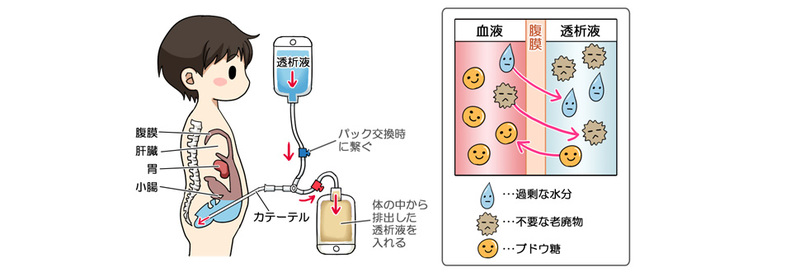 透析とは、低下した腎機能の役割を代替する治療方法の一つです。透析には腹膜透析と血液透析の2種類があり、子どもの場合は腹膜透析が主流です。
