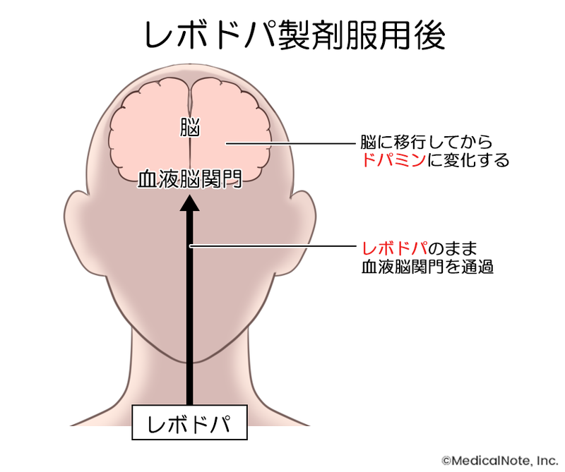レボドパ製剤は、服薬してもその成分すべてが脳組織液へと移行するわけではありません。その多くは脳組織へ移行する前にドパミンやそのほかの物質に変換されてしまいます。