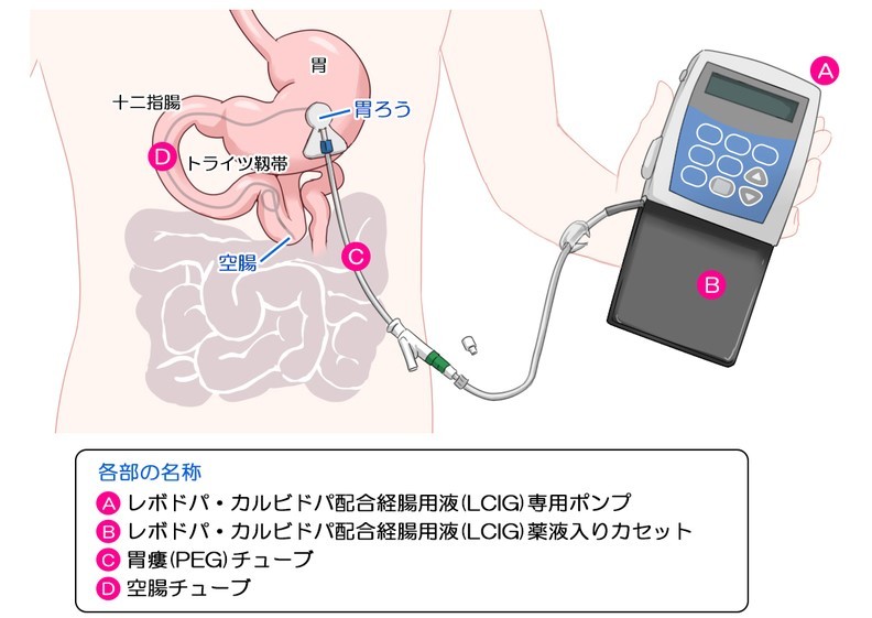 経腸持続投与は、体の外から腸までチューブを通して留置し、持続的に薬を投与する方法で、2016年より日本で保険診療として行われるようになりました。薬の血中濃度を一定に保つことができるため、ジスキネジアを抑え、ウェアリングオフの症状を改善させることが可能です。しかしながら、チューブを体内に留置し管理できる施設が限られることや合併症のリスク、患者さんに機器を操作していただく必要があるといった課題があります。