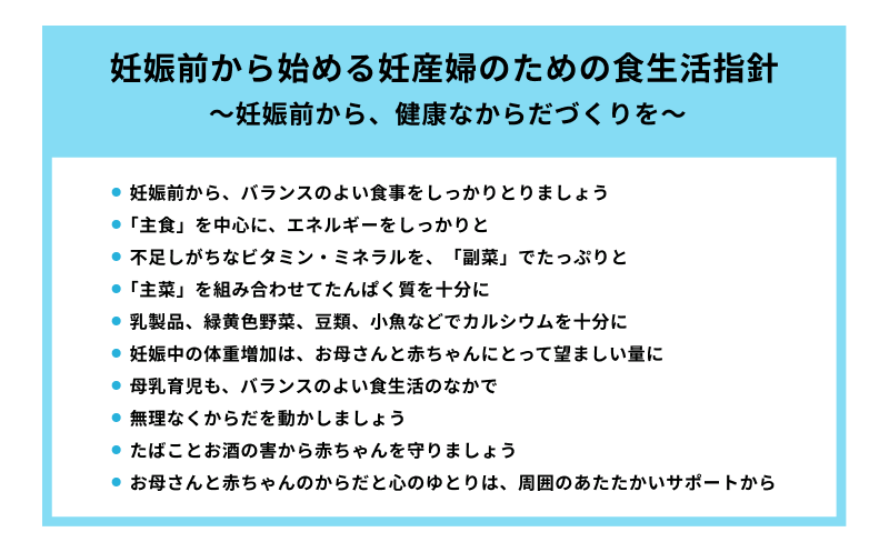 特に若年女性の“やせ”は早産や低出生体重などのリスクを高めることが報告されており、胎児期の発育が不十分であった場合には、成人後に肥満、循環器疾患、2型糖尿病など生活習慣病の発症リスクが高まる可能性が指摘されています。妊娠前から食生活を整えることが将来の健康維持のために重要であり、食生活指針が公表されています。(表1)
