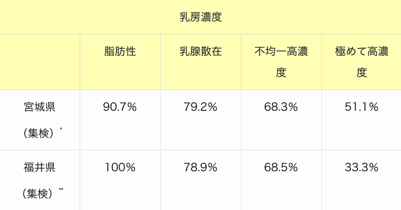 実際にこれまでの研究結果でも、高濃度乳房の状態が強いほどマンモグラフィの感度が低下することが報告されています。下記の表は宮城県、福井県のデータですが、脂肪性乳房よりも極めて高濃度の乳房のほうがマンモグラフィの感度が低下することが示されています。