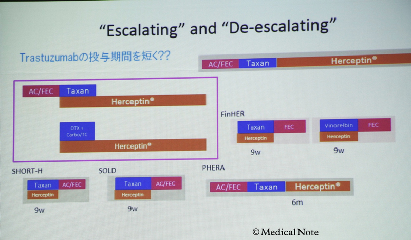 ここでいうEscalatingとは、治療の強度を上げて、生存率100%を目指すことです。たとえば、トラスツズマブを使用した抗HER2療法に、ラパチニブやネラチニブ、TDM-1(トラスツズマブエムタンシン:抗体薬物複合体)を追加することで、治療の効果をさらに高めていく試みがなされています。