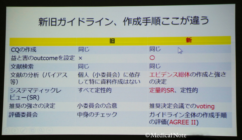 今回の改訂の大きなポイントは、治療による「益(高い生存率など)と害(副作用や費用の問題など)」について考慮して治療介入をするために、ガイドライン作成の手順を大きく見直した点です。