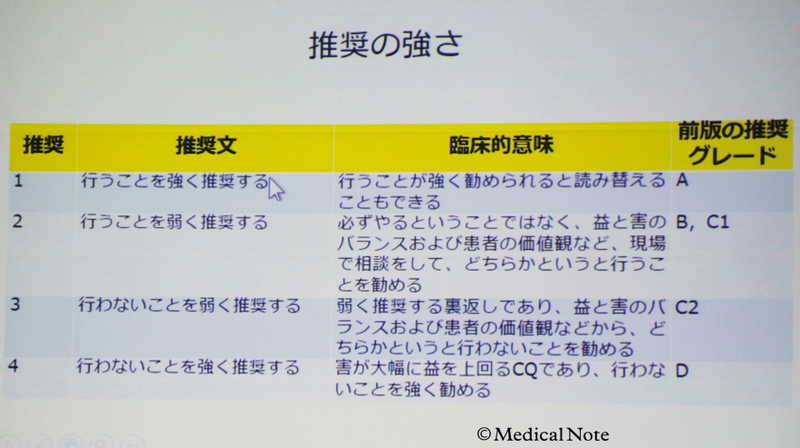 推奨の強さは「行うことを強く推奨する」「行うことを弱く推奨する」「行わないことを弱く推奨する」「行わないことを強く推奨する」の4つに分類しています。