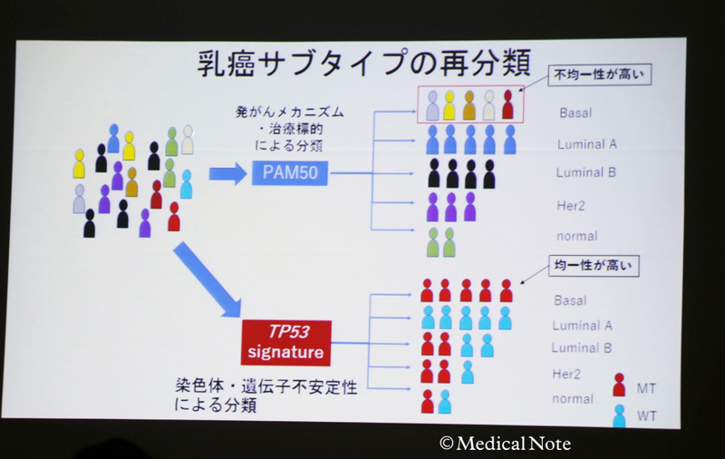 そのほか、乳がんのサブタイプ を再分類することで治療の最適化を図ることができる可能性もあります。たとえば、発がんメカニズムや治療標的による分類においてこれまで均一性が高いといわれていたルミナルBタイプは、TP53 signatureを用いることでwild typeとmutant typeに分けることができます。wild typeは抗がん剤への感受性が低く、mutant typeは抗がん剤への感受性が高いことから、抗がん剤の治療適応を決定する際の指標にすることができる可能性があります。