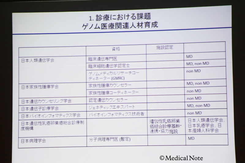 そのなかで、乳がんに関連するものとしては「遺伝性乳癌卵巣癌総合診療制度機構」です。また、日本病理学会でも分子病理専門医(暫定)が発足していて、2018年5月現在、73名の分子病理専門医が誕生しています。分子病理専門医には、主にゲノム情報の品質管理などの役割が課せられます。