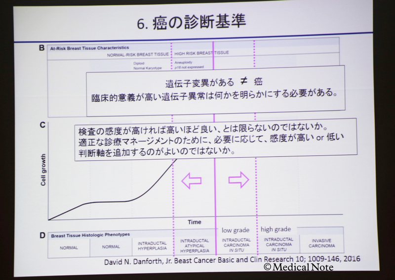 それでは、がんの診断基準はどのようにすればよいのでしょう。Danforth先生の論文によると、がんの可能性がまったくない検体にも、染色体レベルの異常や構築の変化などが起こっていることから、遺伝子変異があることが必ずしもがんを発症しているとは限らないといわれています。そのため、単に遺伝子変異をみるのではなく、臨床的な意義が高い遺伝子異常は何かについて明らかにする必要があります。