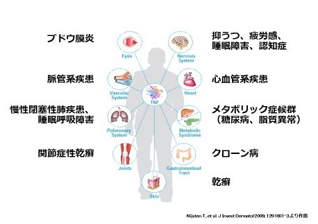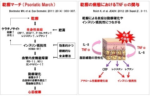 これは、乾癬に罹患して皮膚の状態が悪くなることも原因ですが、近年では乾癬の原因となる成分の一つであるTNF-αと言われる成分が過剰になることにより、精神にも作用する可能性があると考えられています。また、そのTNF-αは体内の血管に作用して炎症を引き起こし、糖尿病の治療の阻害や、心血管病変の原因を形成する可能性が指摘されており、その状態を乾癬マーチとよび、乾癬を治療することにより乾癬マーチを止め、心血管系への負担を減らすことが健康余命につながると考えられています。