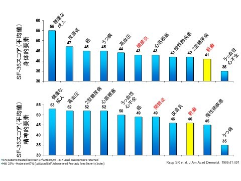 乾癬はもともと生活の質(QOL(quality of life))が低い疾患であり、合併症としてうつ等の精神疾患の存在も認めています。