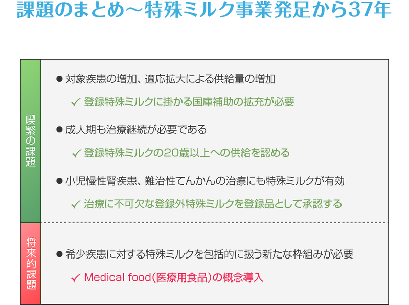 また、特殊ミルクは治療に用いる医療用食品であるため医師を介さず直接患者さんが購入するには使用上の危険が伴います。そのため特別用途食品として販売するというアイディアがでているものの、その実現は難しいといえるでしょう。