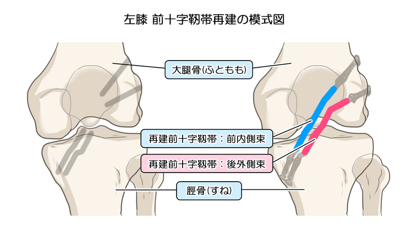 前十字靭帯再建術とは、膝のうしろにある屈筋腱、または膝の前にある伸筋腱といった「自家腱」を関節内に移植し、固定する手術です。