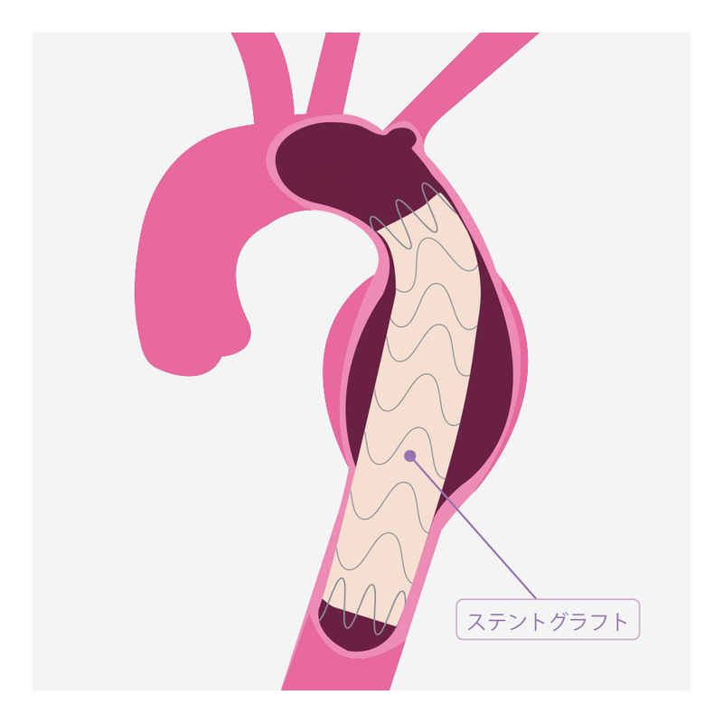 B型の大動脈解離で、血管が破裂しかけていたり、本来の血管が偽腔に押されて狭くなることで腹部臓器(特に腸管)の血流が悪くなっていたりする場合には、ステントグラフトを使った血管内治療が行われることがあります。