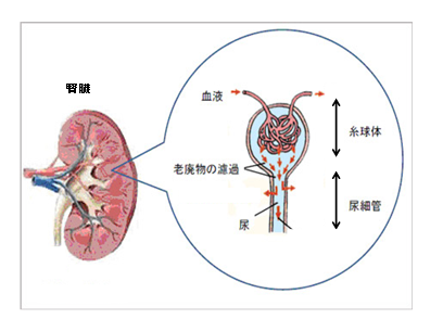 腎臓は血液をきれいにする臓器なので、たくさんの血液が腎臓を通ります。尿は、まず腎臓の糸球体というところで血液からこしとられ(濾過され)、次に尿細管という部分で調整されて作られています。