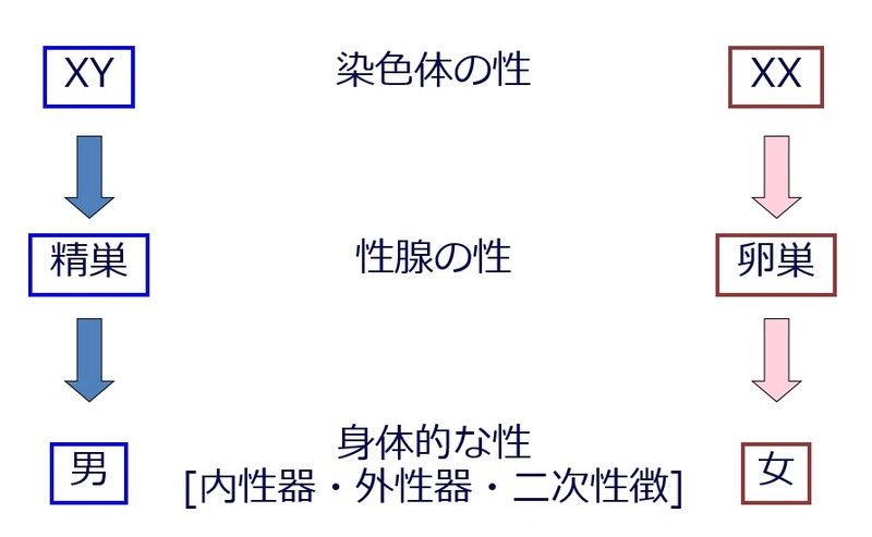 ヒトの性は、46本ある染色体のうち、性を司る2本の性染色体の組み合わせによって決まります。性染色体の組み合わせが「X」「Y」だと男性に、「X」「X」の組み合わせだと女性になります。