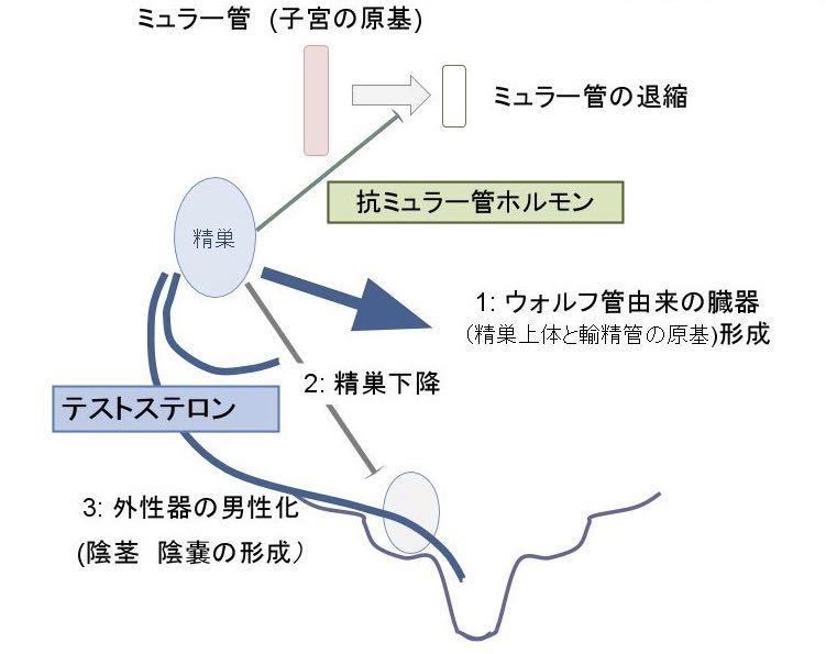 内性器、外性器は胎生期に形作られますが、原則としてこれらは、性腺が精巣であるかどうか、つまり精巣から分泌されるホルモンの有無で決まります。これらに卵巣から分泌される女性ホルモンは寄与しません。もう少し具体的に述べると、胎児期に精巣からは主に2つのホルモンが分泌されます。アンドロゲン(テストステロン、男性ホルモン)と抗ミュラー管ホルモンです。アンドロゲンは主に3つのはたらきをします。