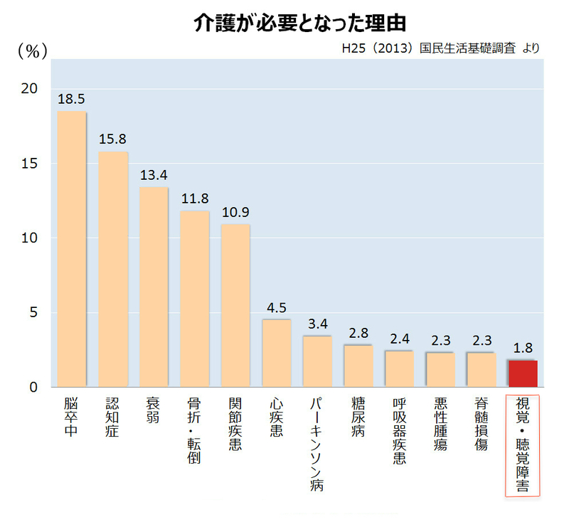 こちらは厚生労働省から報告されている「平成25年 国民生活基礎調査」のデータから、介護が必要になった原因についてまとめたグラフです。グラフをみてみると介護になる原因として最も大きなものは脳卒中であり、その次に認知症、衰弱、骨折・転倒、関節疾患、心疾患……と続いていきます。そして視覚・聴覚障害は上から数えて12番目の原因であることが示されています。