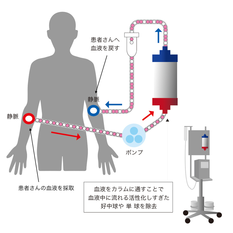 顆粒球・単球吸着除去療法とはこれまでの治療法とは全く異なる治療方法であり、炎症を起こす原因となっている、血液中に流れる活性化しすぎた好中球や単球を除去することで症状を改善させる治療法です。上図のように血液を体外の専用カラムに通していくことで、カラムに活性化しすぎた好中球や単球が吸着され、取り除くことができます。